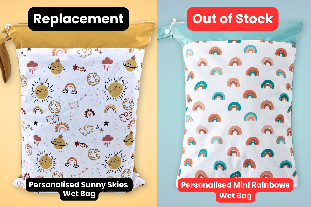 The Personalised Mini Rainbows Wet Bag is out of stock and will be replaced with the Personalised Sunny Skies Wet Bag.