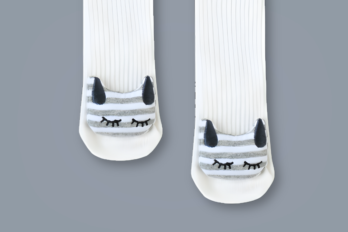 Perfect for sleepy days! These classic white, ribbed socks feature a striped kitten face with sleepy closed eyes. Crafted from a premium, gentle material, they offer excellent breathability and a non-slip fit. The long cuff protects sensitive ankles and ensures these cozy companions stay firmly on little explorers’ feet.
