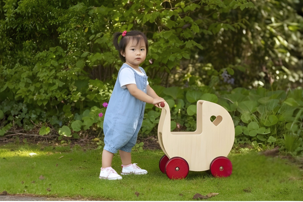 Crafted from wood, this classic toddler walker doubles as a charming doll pram. Its sturdy design and smooth-rolling wheels provide essential stability for little ones taking their first steps. Featuring a sweet heart cutout and a timeless aesthetic, it encourages imaginative play and motor skill development in every stroll.